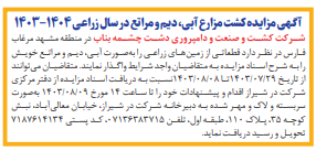 شرکت کشت و صنعت و دامپروری دشت چشمه بناب در منطقه مشهد مرغاب فارس در نظر دارد قطعاتی از زمین های زراعی را بصورت آبی ، دیم و مراتع خویش را به شرح اسناد مزایده به متقاضیان واجد شرایط واگذار نمایند. متقاضیان می توانند از تاریخ 1404/07/28 تا 1404/08/07نسبت به دریافت اسناد مزایده از دفتر مرکزی شرکت در شیراز اقدام و پیشنهادات خود را تا ساعت 14:00 مورخ 1404/08/07 بصورت سربسته و لاک و مهر شده به دبیرخانه شرکت در شیراز خیابان معالی آباد – نبش کوچه 35 – پلاک 110 – طبقه اول تلفن 07136383715 کد پستی 7187614134 تحویل و رسید دریافت نماید.